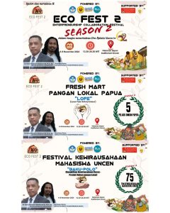 Dalam rangka menyambut Dies Natalis UNCEN ke-62 maka tim kewirausahaan UNCEN mengadakan ECO FEST 2, SEASON 2 yang bertempat di halaman Auditorium UNCEN yang berlangsung pada tanggal 6-8 November 2024. Untuk ketiga kalinya, 4 tim kewirausahaan mahasiswa program studi pendidikan fisika ikut terlibat di dalam Festival Kewirausahaan ECO FEST 2, SEASON 2 yang bertajuk “BAKU-POLO” (Bangkitkan Kewirausahaan Uncen-Produk Olahan Pangan Lokal). Pada ECO FEST 2, SEASON 2 ini seluruh tim diminta untuk menghadirkan pangan lokal Papua, terkecuali ROTI MAITRI (Roti Abon Ulat Sagu) yang telah terintgrasi pangan lokal Papua. Oleh karena itu, tim BURGER JAMUR menghadirkan menu tambahan makanan lokal Papua yang berupa singkong rebus + sayur jantung pisang bunga pepaya + ikan saos. BALEBA menghadirkan menu tambahan makanan lokal Papua yang berupa papeda bungkus ikan saus. Abon crispy PEPMUD menghadirkan menu tambahan makanan lokal Papua yang berupa keladi, daun singkong dan ikan saos.